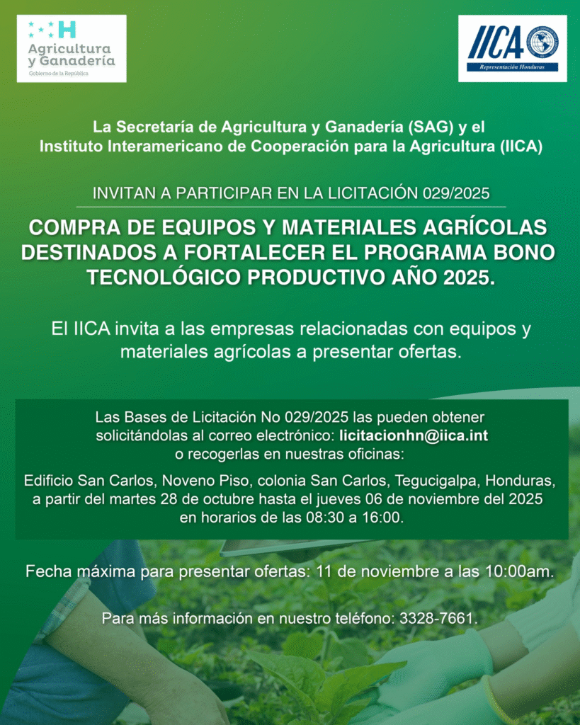 Tegucigalpa, 29 oct (AHN) La Secretaría de Agricultura y Ganadería (SAG), de Honduras, anunció hoy la licitación para la compra de equipos y materiales agrícolas destinados a fortalecer el Programa Bono Tecnológico Productivo durante el próximo año.