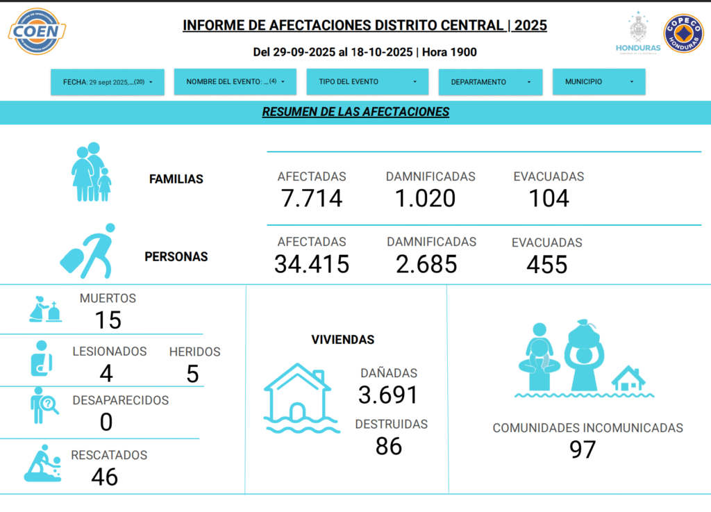 El documento detalla que 97 comunidades permanecen incomunicadas en 12 departamentos del país, principalmente en Francisco Morazán (centro) , Valle, Choluteca (sur), Lempira (occidente), Yoro (norte). Asimismo, 3.691 viviendas resultaron dañadas y 86 destruidas por las inundaciones y derrumbes.