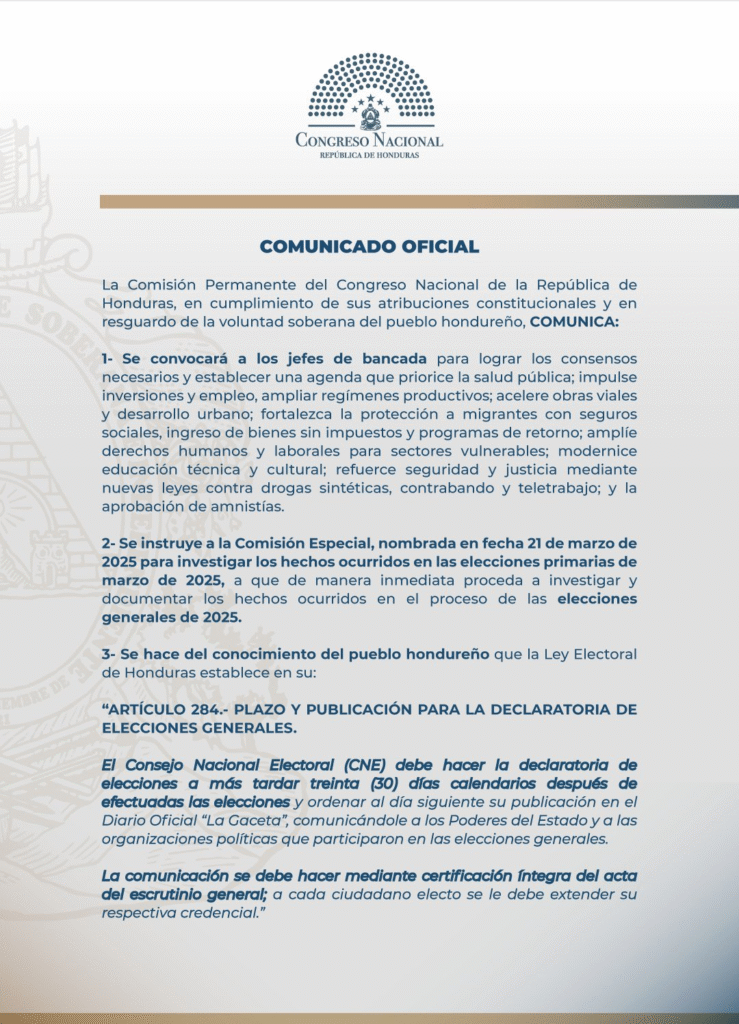 Asimismo, afirmó que se instruyó a la Comisión Especial nombrada el 21 de marzo de 2025, que en su momento investigó los hechos ocurridos durante las elecciones primarias de ese mismo año, para que de manera inmediata documente e investigue los acontecimientos relacionados con el proceso de las elecciones generales de 2025.