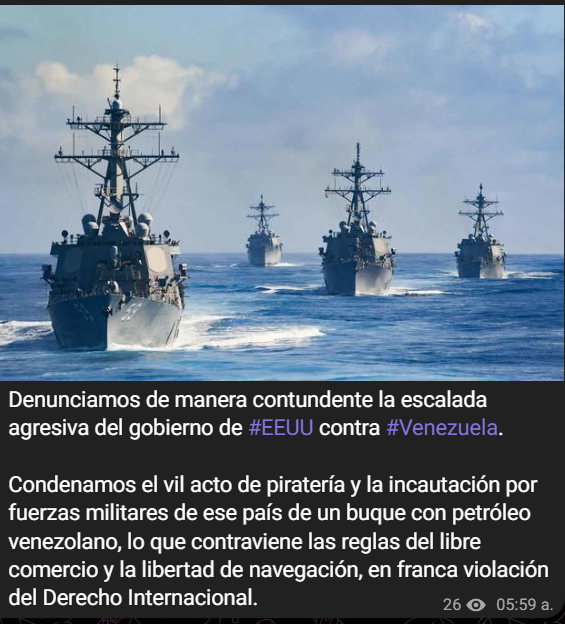 Tegucigalpa, 11 dic (AHN) El Ministerio de Relaciones Exteriores de Cuba condenó hoy la nueva “escalada agresiva” del gobierno de Estados Unidos contra Venezuela, tras la incautación por parte de fuerzas militares estadounidenses de un buque que transportaba petróleo venezolano.