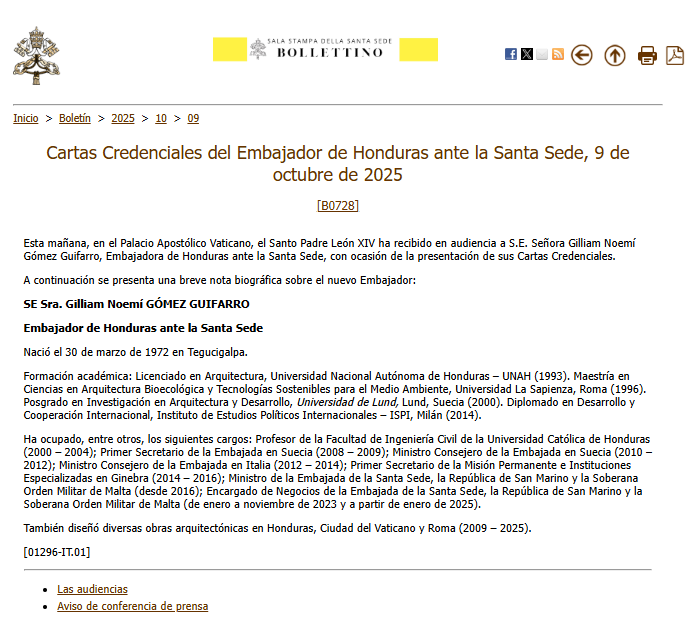 Tegucigalpa, 10 oct (AHN) La embajadora de Honduras ante la Santa Sede, Gilliam Gómez, presentó sus Cartas Credenciales al Papa León XIV durante una audiencia oficial celebrada en el Palacio Apostólico del Vaticano.