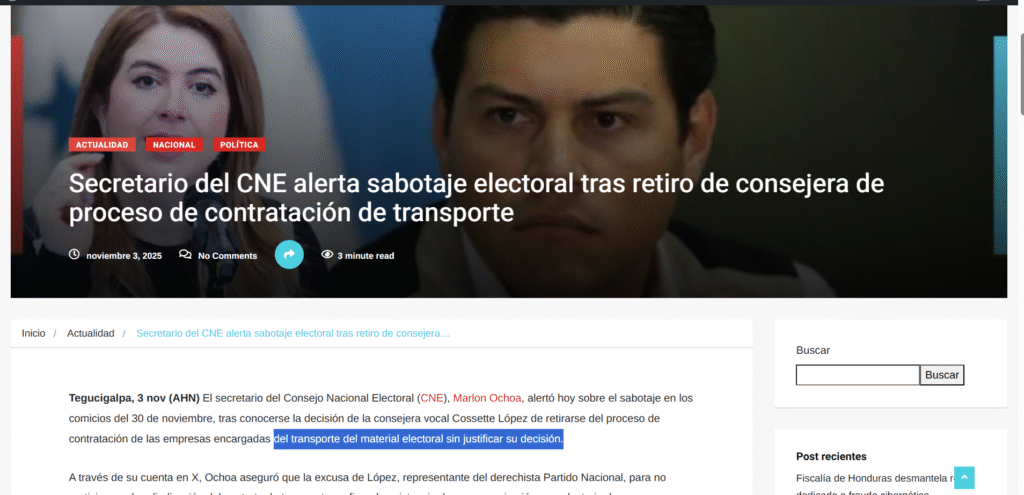 El ex canciller también señaló que esta situación coincide con los audios de boicot electoral atribuidos a la consejera del Consejo Nacional Electoral (CNE), Cossette López, en los que, según una de las grabaciones, la consejera nacionalista menciona la necesidad de retrasar y complicar el transporte electoral, algo que —afirmó— “ha ocurrido”, recordando que las licitaciones del CNE han enfrentado múltiples obstáculos.