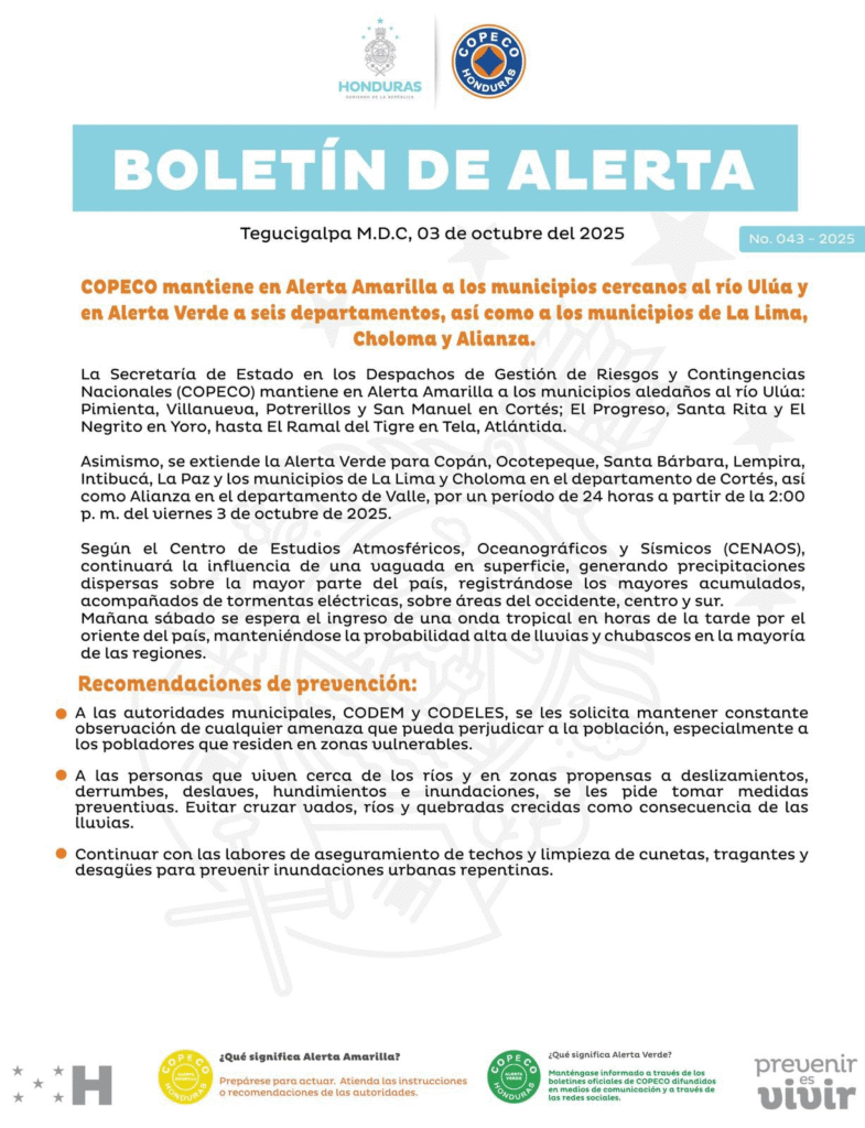 En un comunicado oficial, difundido en sus redes sociales, Copeco indicó que también se incluyen los municipios de El Progreso, Santa Rita y El Negrito en Yoro; y El Ramal del Tigre en Tela, Atlántida, (norte).