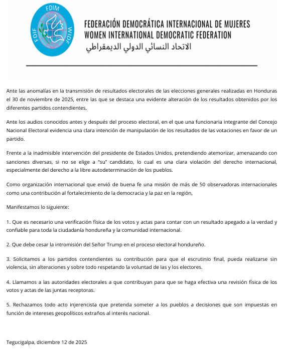 Tegucigalpa, 12 dic (AHN) La Federación Democrática Internacional de Mujeres (FDIM) expresó hoy preocupación por las anomalías detectadas en la transmisión de resultados de las elecciones generales realizadas en Honduras el pasado 30 de noviembre de 2025.