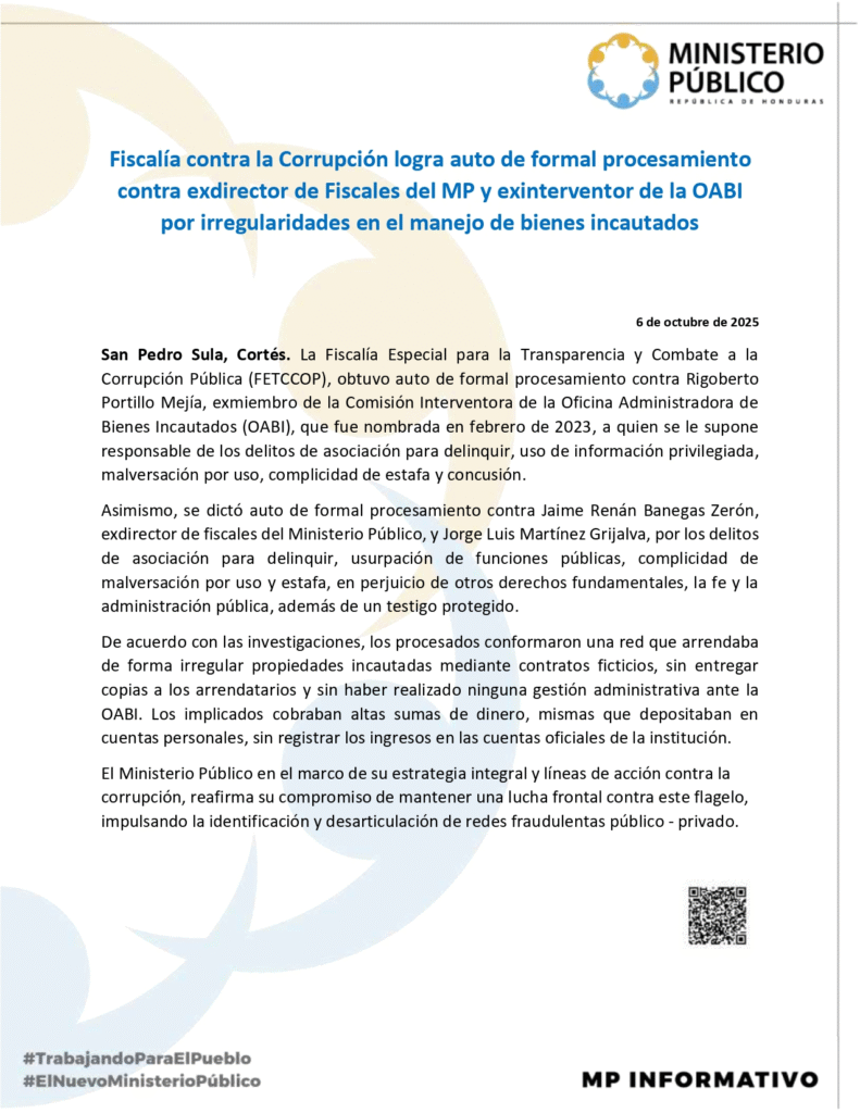 Tegucigalpa, 6 oct (AHN) La Fiscalía Especial para la Transparencia y Combate a la Corrupción Pública hondureña, logró hoy auto de formal procesamiento contra Rigoberto Mejía, acusado de integrar una red de corrupción vinculada al manejo irregular de propiedades incautadas.