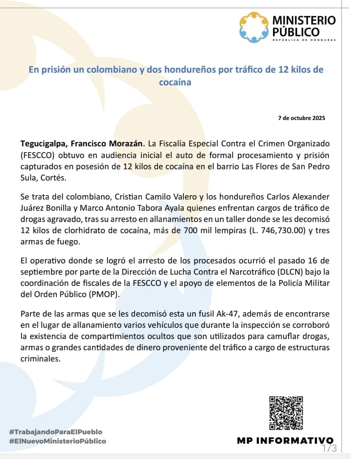 Mediante un comunicado, el Ministerio Público (MP) informó que el allanamiento se realizó en un taller ubicado en el barrio Las Flores de San Pedro Sula, donde se les decomisó más de 700,000 lempiras (26.7 millones de dólares), y tres armas de fuego, entre ellas un fusil AK-4.