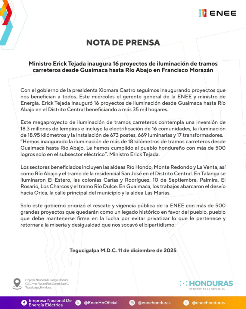 La ENEE señaló que estas obras se ejecutan en el marco de la política pública del Gobierno, que busca fortalecer la seguridad vial, apoyar el desarrollo local y mejorar la calidad de vida de miles de hondureños mediante infraestructura energética moderna y sostenible.