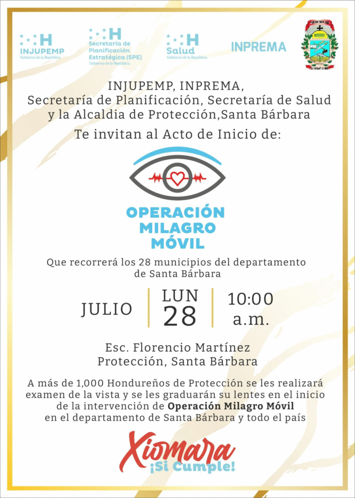 Tegucigalpa, 25 jul (AHN) El director del Instituto Nacional de Jubilaciones y Pensiones de los Empleados y Funcionarios del Poder Ejecutivo —Injupemp— Amable de Jesús Hernández, anunció hoy el lanzamiento del programa Operación Milagro Móvil, una iniciativa que recorrerá Honduras para ofrecer atención oftalmológica gratuita.