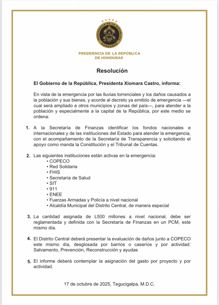 Además, agregó que el Distrito Central, en coordinación con la Comisión Permanente de Contingencias (Copeco), deberán presentar una evaluación detallada de los daños, desglosada por barrios y caseríos, así como por actividades de salvamento, prevención, reconstrucción y ayuda humanitaria, contemplando además la asignación del gasto por proyecto y actividad.
