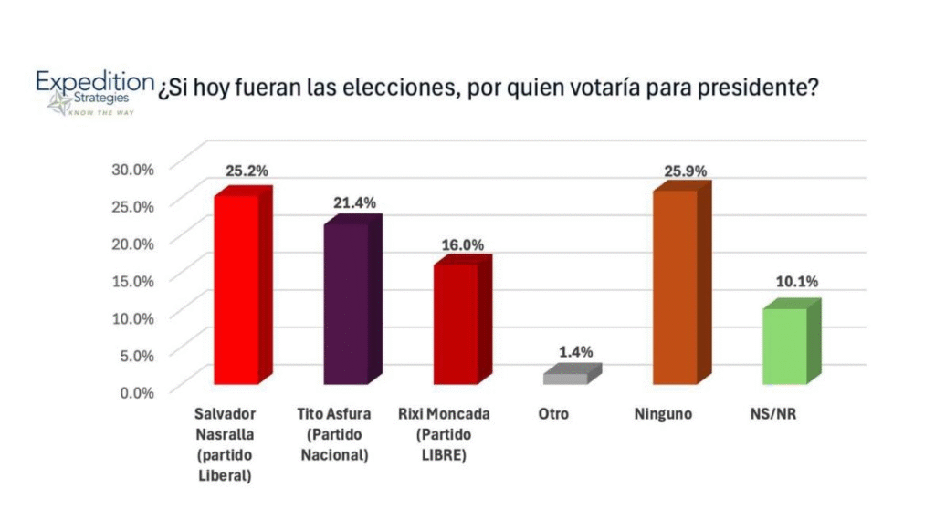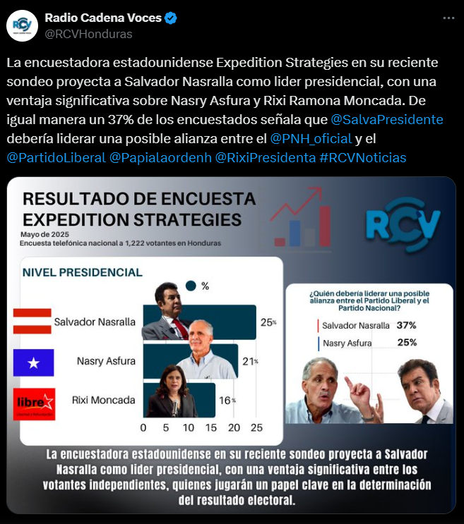 Cabe mencionar, que periodistas de las grandes cadenas de comunicación en el país afines al bipartidismo, difundieron resultados de la firma estadounidense Expedition Strategies que mostraban a Nasralla liderando la intención de voto y aunque la empresa tiene amplia trayectoria en Estados Unidos y otros países, su sitio web no registra clientes hondureños ni estudios recientes en la región, por lo que se asume que las publicaciones pueden ser falsas.