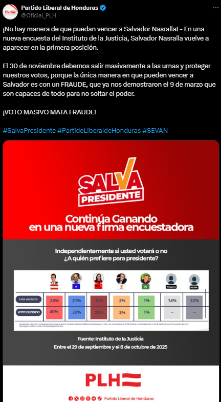 En octubre de 2025, el Partido Liberal también difundió una encuesta atribuida al Instituto de la Justicia, Think Tank, impulsado por la Asociación para una Sociedad más Justa (ASJ).