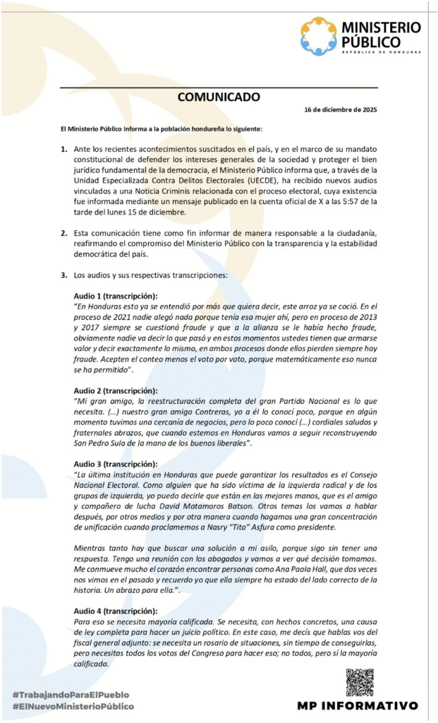 El portavoz del MP también recordó que continúan con las investigaciones de tres audios presentados la semana anterior, en donde vinculan a la representante del Consejo Nacional Anticorrupción, Gabriela Castellanos y la representante del Consejo Nacional Electoral, Cossette López, por presuntamente asociarse para publicar resultados en favor del candidato presidencial del Partido Nacional (PN), Nasry Asfura.
