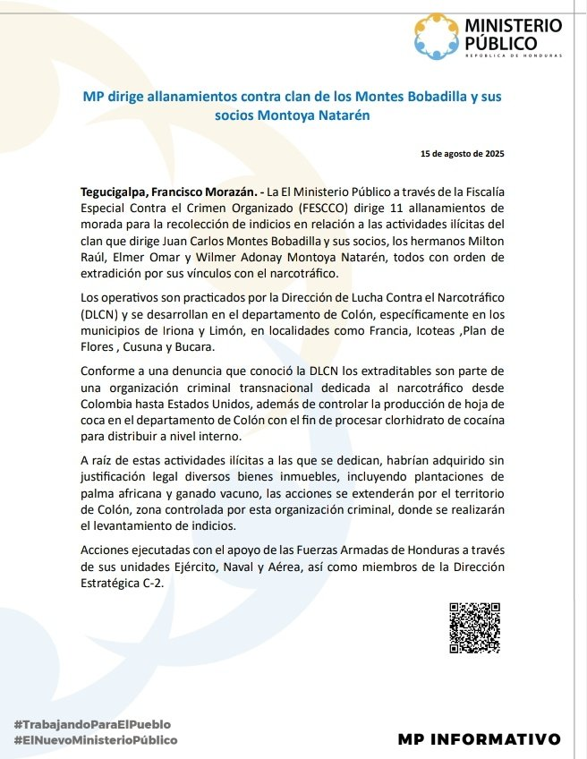 Tegucigalpa, 15 ago (AHN) El Ministerio Público (MP) de Honduras, realizó hoy 11 allanamientos contra el “clan” de los Montes Bobadilla y sus socios Montoya Natarén, todos con orden de extradición a Estados Unidos por sus supuestos vínculos con el narcotráfico.