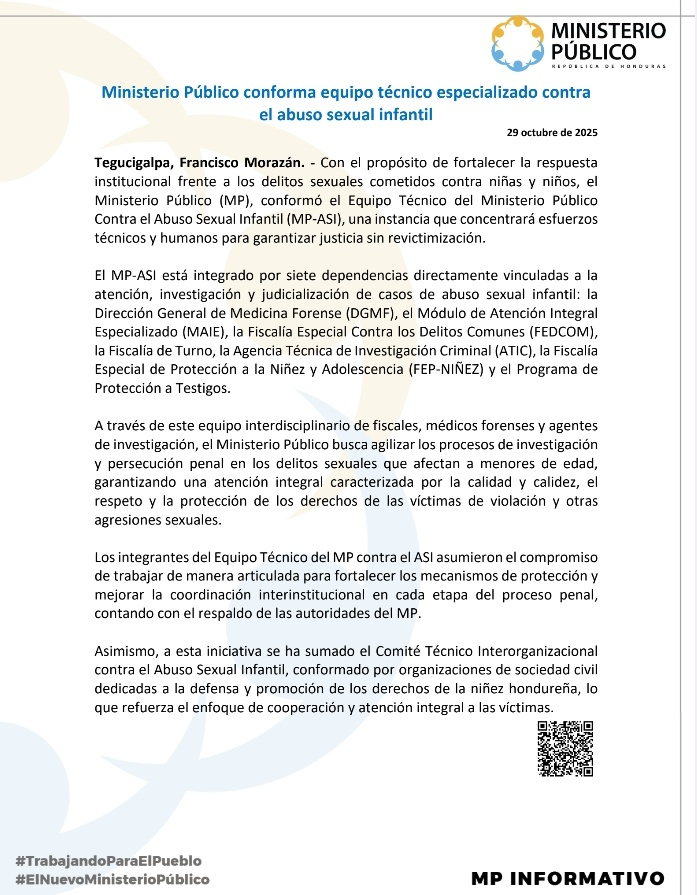 Tegucigalpa, 30 oct (AHN) El Ministerio Publico de Honduras (MP), conformó un Equipo Técnico Contra el Abuso Sexual Infantil (MP-ASI), con el objetivo de agilizar la investigación y judicialización de los delitos sexuales contra la niñez del país.
