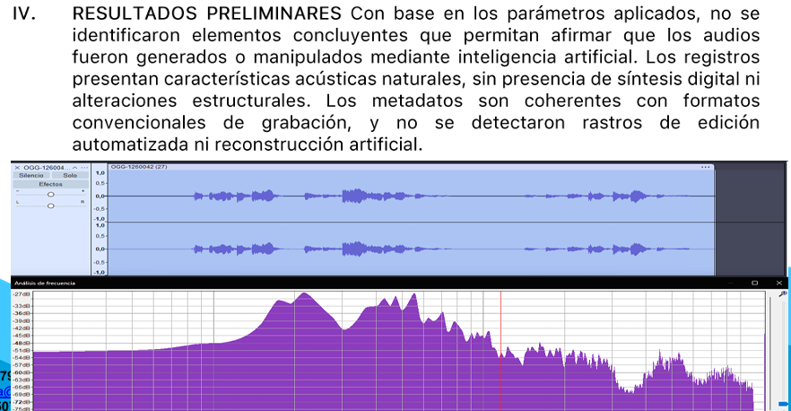 El informe detalla que las grabaciones fueron sometidas a cotejos de integridad, análisis espectrales, verificación de metadatos y filtros de detección de edición digital, clonación vocal y síntesis automatizada.
