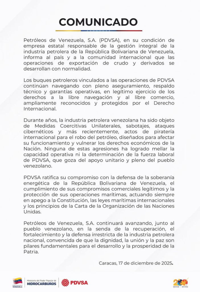 A través de un comunicado oficial, la empresa venezolana petrolera señaló que los buques vinculados a sus operaciones continúan navegando con pleno aseguramiento, respaldo técnico y garantías operativas, en ejercicio legítimo del derecho a la libre navegación y al libre comercio, principios reconocidos y protegidos por el Derecho Internacional.