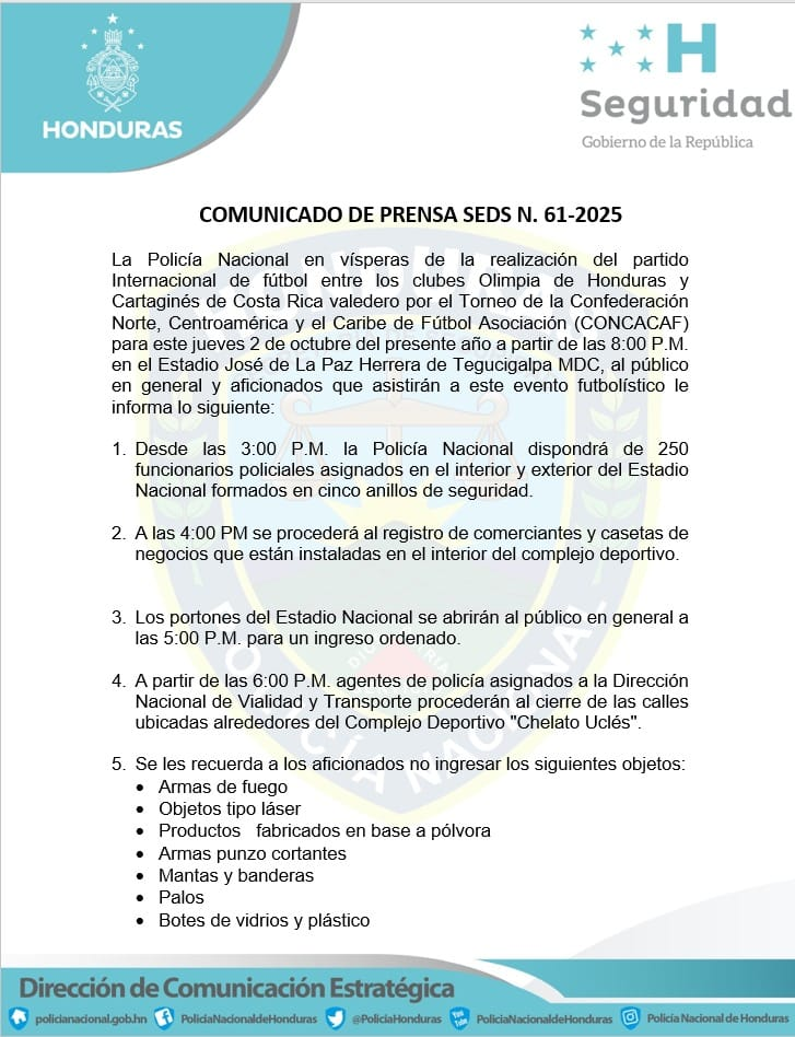 Finalmente, la PN destacó que el objetivo del operativo es garantizar a la población hondureña que el espectáculo deportivo se desarrolle en un ambiente de sano entretenimiento y de respeto mutuo.