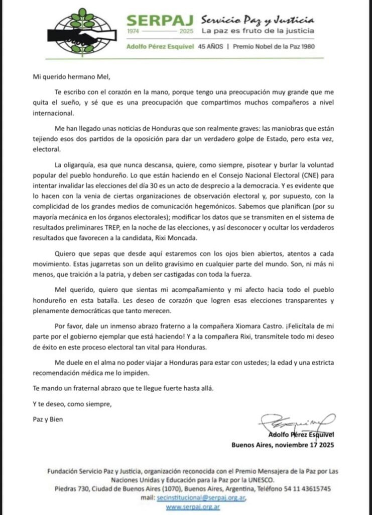Me han llegado unas noticias de Honduras que son realmente graves: las maniobras que están tejiendo esos dos partidos de la oposición para dar un verdadero golpe de Estado, pero esta vez, electoral”, manifestó Pérez Esquivel.