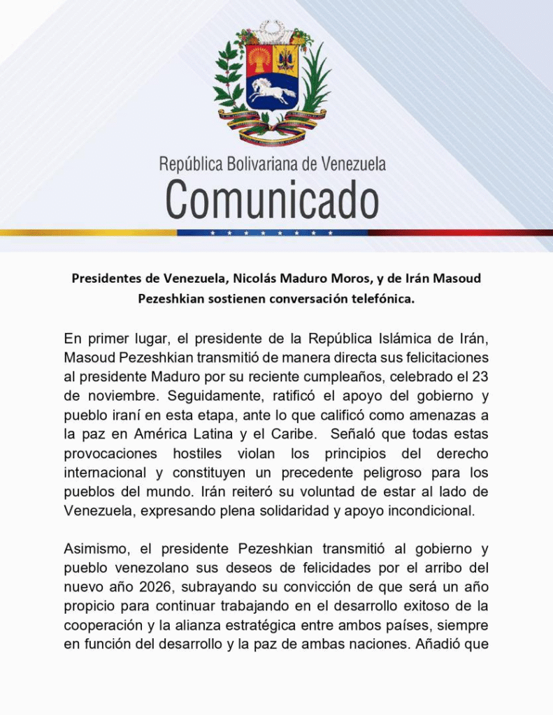 Asimismo, el presidente iraní transmitió sus buenos deseos al gobierno y pueblo venezolano por la llegada del año 2026, al tiempo que manifestó su confianza en que continuará el desarrollo de la cooperación y la alianza estratégica entre ambos países, con énfasis en la paz y el progreso.