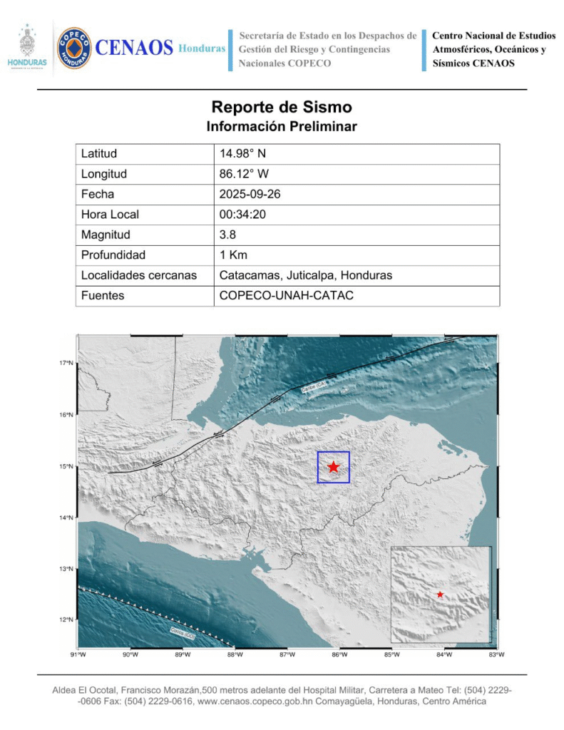 Tegucigalpa, 26 sep (AHN) La Comisión Permanente de Contingencias (Copeco) informó hoy que, en la medianoche del jueves un sismo de magnitud 3,8 se registró entre los municipios de Catacamas y Juticalpa, en el departamento de Olancho al oriente de Honduras.